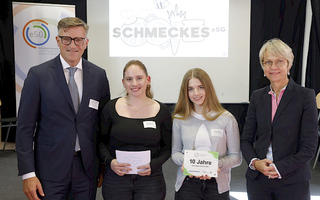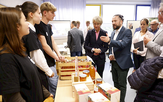 Nach dem musikalischen Auftakt mit dem selbst verfassten „Schmeckes-Rap“ folgten die zentralen Grußworte von Schulleiter Tim Meier, Schirmherrin und NRW-Schulministerin Dorothee Feller sowie Peter Götz, zuständiges Vorstandsmitglied des Genoverband e.V..