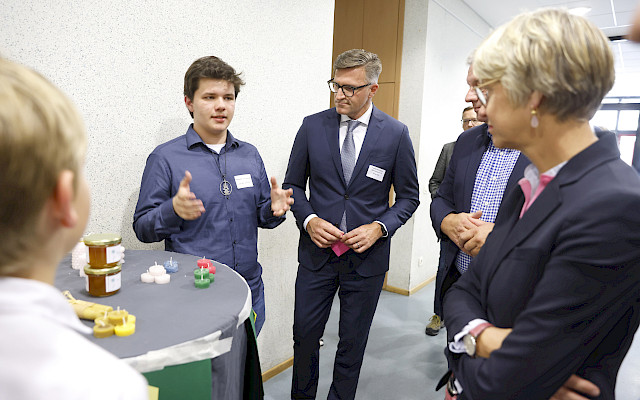 Beim anschließenden Rundgang wurden die vielfältigen Geschäftsmodelle der jungen Unternehmer*innen erlebbar. Die bunten Stände präsentierten stolz ihre nachhaltigen Produkte und zehn Jahre Erfahrung im Schülergenossenschaftswesen.